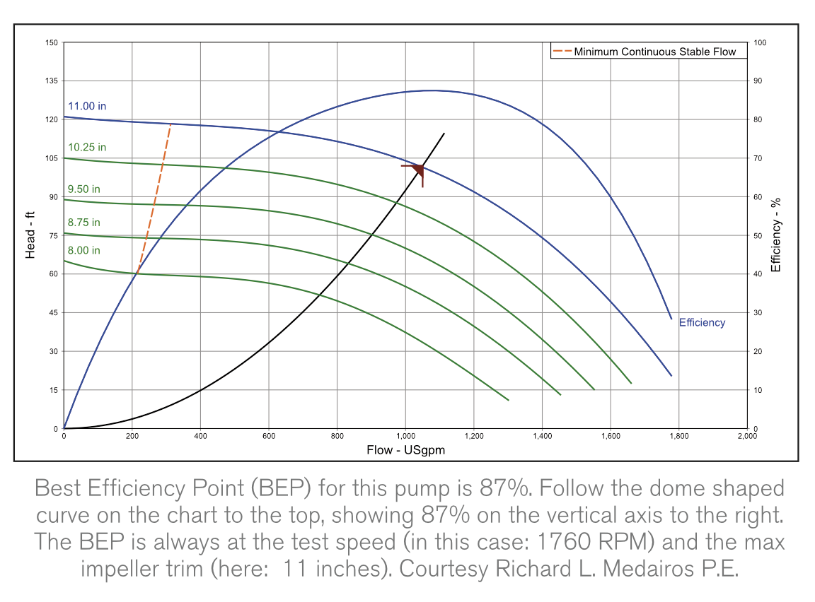 Best Efficiency Point (BEP) is the point of the operations curve that is, simply, most efficient. Set the system operating too low, and there is not enough power to produce the desired result in a timely manner. Set it too high, and you expend too much energy. The “sweet spot” is the BEP.