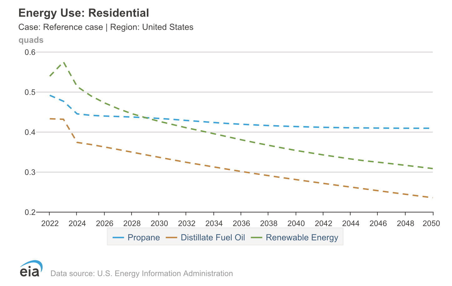 On the graph of residential consumption comparing Propane, Distillate Fuel Oil, Natural Gas, Renewable Energy and Purchased Electricity, the results appear relatively flat, with a small uptick from 5.15 (quads) in 2022 to 6.18 in 2050. At this scale, the other fuels appear unchanged.