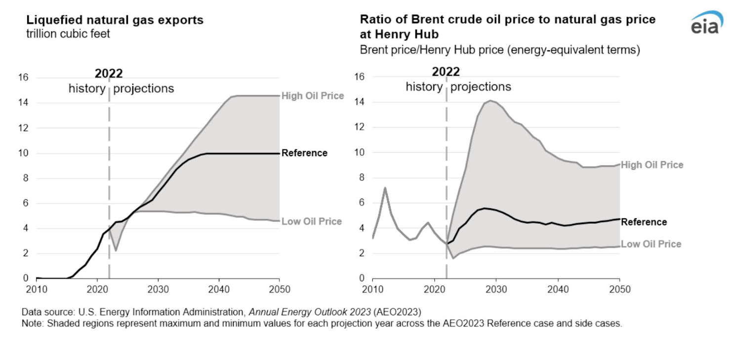 Export demand for liquid natural gas is expected to drive natural gas production, especially in areas with better access to terminals, as in the Southwest and Gulf Coast. AEO2023 notes a weakening in the historical correlation of international natural gas and oil prices due to the growth of market based-LNG, but anticipates that oil prices will continue to affect LNG export capacity and overall export levels.