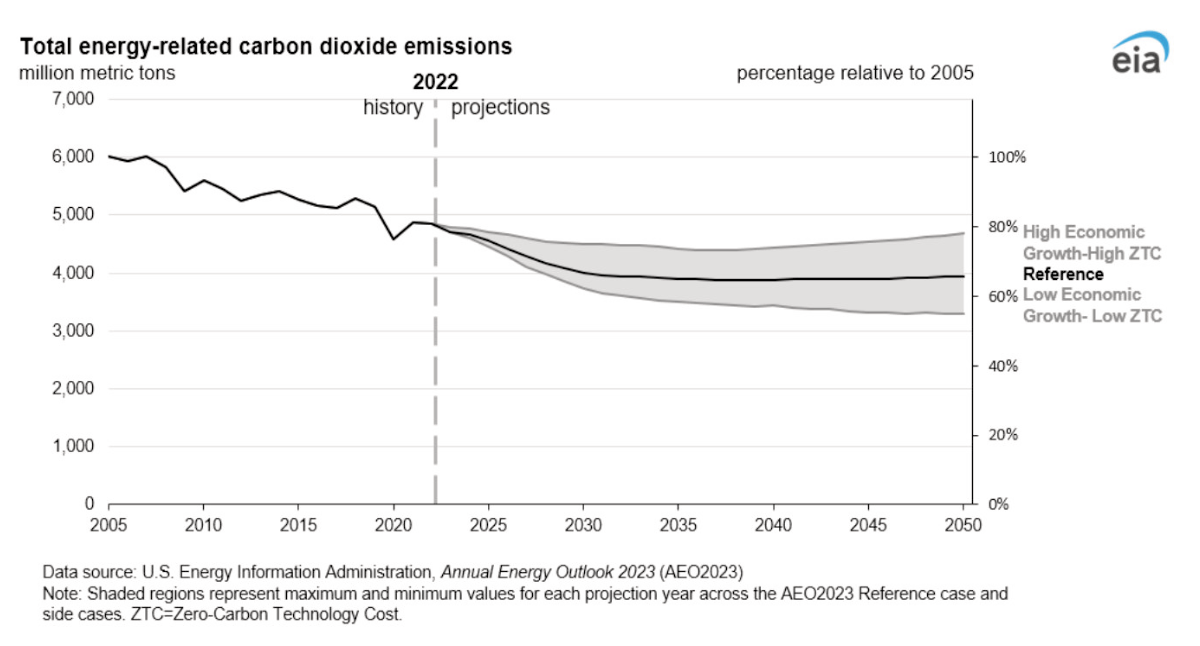 The lower energy-related CO2 emissions are driven by increased electrification and improvements in equipment efficiency and renewable technologies for energy generation. At the same time, AEO2023 reports that “emissions reductions are limited by longer-term growth in U.S. transportation and industrial activity.”