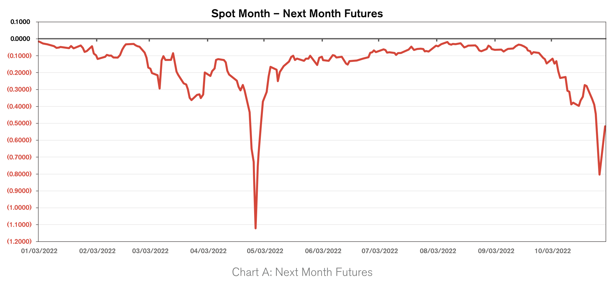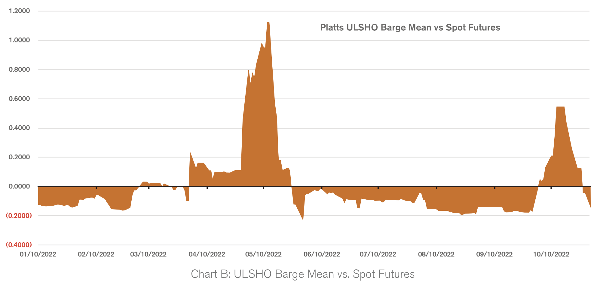 As if the futures’ market in backwardation doesn’t make supplying the local terminals difficult enough, suppliers are now dealing with a cash market price that has been continually higher than the spot month futures’ price (Chart B). This places a two-dimensional risk in front of them.