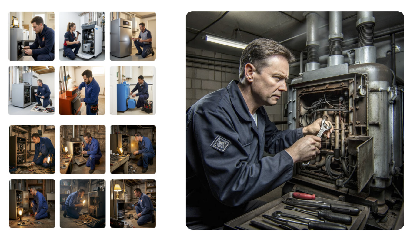 When a new image-generating platform was announced, our team ran yet another experiment. (See images above.) First, the engine was asked to produce images of a “heating technician working on an oil boiler.”