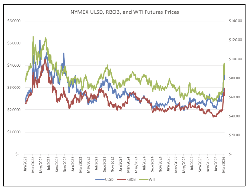 Crude oil, gasoline, and distillate futures have all surged in early March (at the time of this writing), with both WTI and Brent crude oil prices briefly pushing above $100 per barrel (bbl) as tensions escalated in the Middle East. The rally has been driven primarily by fears surrounding the Strait of Hormuz. The narrow waterway connecting the Persian Gulf to the Gulf of Oman is one of the most important transit routes in global energy trade. Roughly 20 million barrels per day (mb/d), or about 20% of global supply of crude oil and refined products, pass through the strait.
