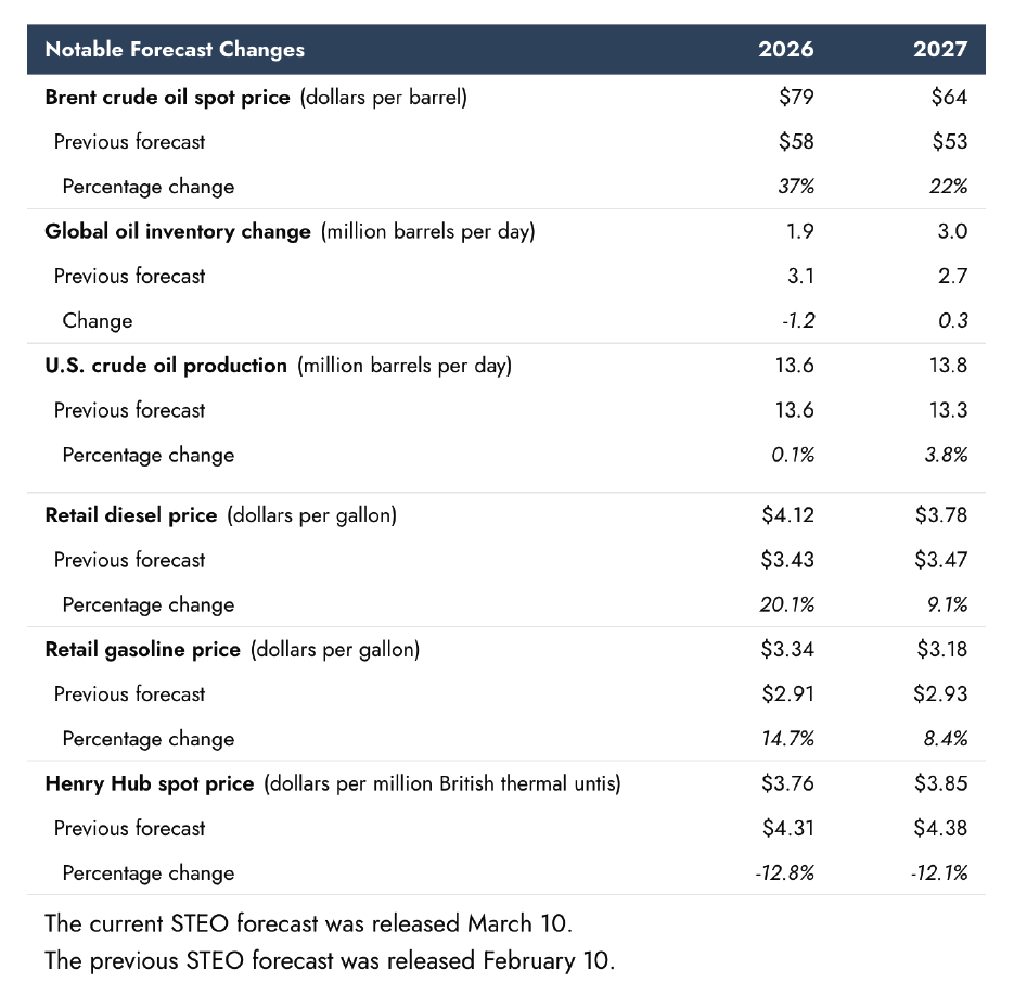 The forecast for Brent crude oil increased 37 percent – from $58 to $79 per gallon for 2026 – between the February and March reports. The retail diesel price forecast increased 20.1 percent, and the retail gasoline price increased 14.7 percent.
