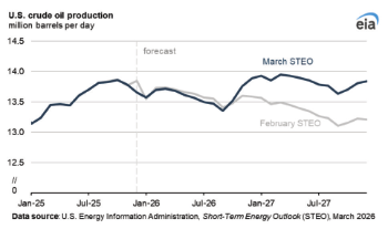 U.S. crude oil production. Higher crude oil prices lead to more U.S. crude oil production in our forecast. We expect crude oil production in the United States will average 13.6 million barrels per day (b/d) in 2026 and 13.8 million b/d in 2027. Our 2027 forecast is an upward revision of about 0.5 million b/d (4 percent) from last month’s Short-Term Energy Outlook (STEO). The West Texas Intermediate (WTI) crude oil price in our forecast is substantially higher than last month, averaging $74/b in 2026 and $61/b in 2027, compared with $53/b and $49/b, respectively, in the February STEO.