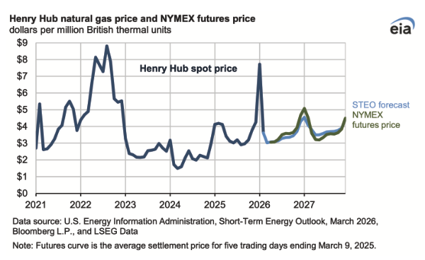 Natural gas prices. Although reduced liquefied natural gas (LNG) flows through the Strait of Hormuz have caused the price of natural gas in Europe and Asia to increase, we expect U.S. natural gas prices to be relatively unaffected by this development. In our forecast, the Henry Hub spot price averages about $3.80 per million British thermal units (MMBtu) in 20 26, or 13 percent less than our forecast last month. Prices in the early part of our forecast are lower because of milder-than-forecast temperatures in February that left more natural gas in storage than we expected. The Henry Hub spot price averages nearly $3.90/MMBtu in 2027, 12 percent lower than our forecast last month. Lower prices in 2027 mostly reflect more associated natural gas production as a result of the recent increase in oil prices and the related increase in production later in the forecast.