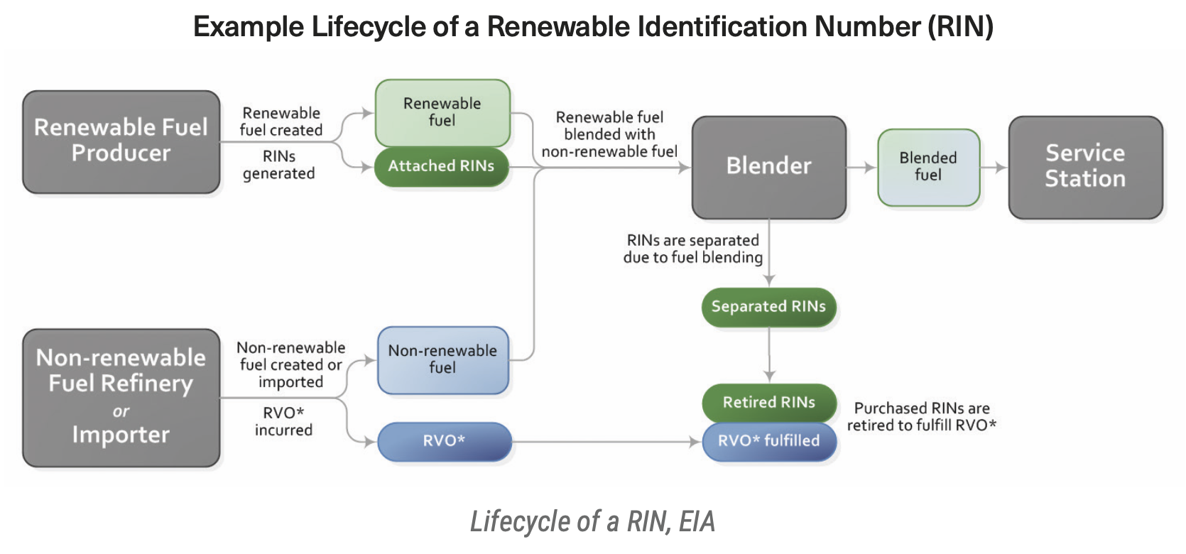 The Renewable Fuel Standard determines the Renewable Volume Obligation (RVO) – the volume of renewable fuels that need to be blended into transportation fuels. RINs are the credits used to prove RFS compliance by the obligated parties – producers, refiners, and importers.