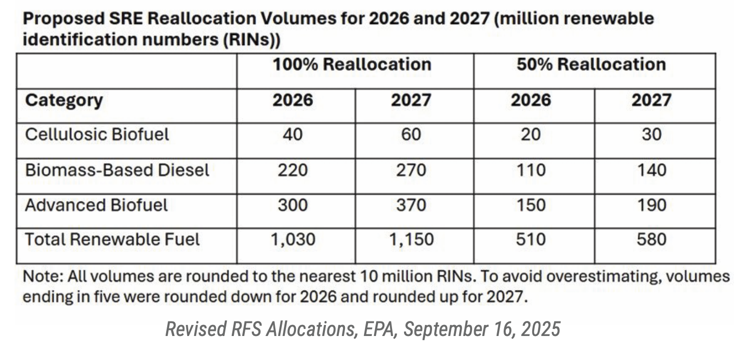 Following the comment period, the EPA published a supplemental proposal in September 2025, in which it proposed “to add a new SRE reallocation volume’ term in the percentage standard equations for 2026 and 2027 that, taken together, would account for the 2023–2025 exempted RVOs. In addition, we are revising our proposed percentage standards for 2026 and 2027 to include both the proposed SRE reallocation volumes and a better informed projection of exempted gasoline and diesel for 2026 and 2027.”