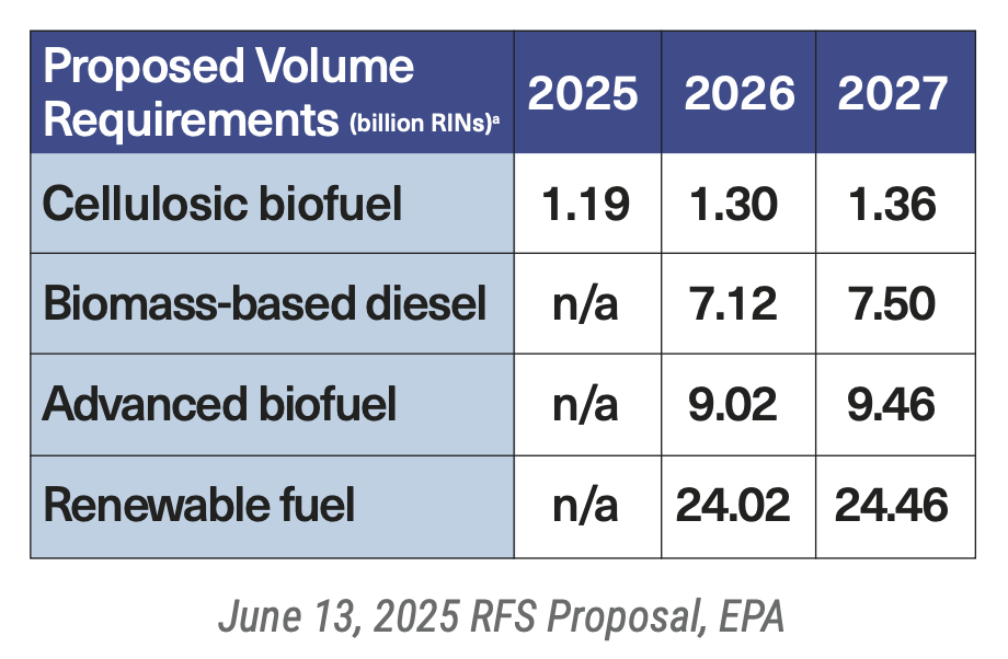 Regarding the RVOs, the EPA stated, “On June 13, 2025, EPA announced a proposed rule to establish required Renewable Fuel Standard volumes and percentage standards for 2026 and 2027, as well as to partially waive the 2025 cellulosic biofuel volume requirement and revise the associated percentage standard due to a shortfall in cellulosic biofuel production. The proposed volume requirements are listed below.”